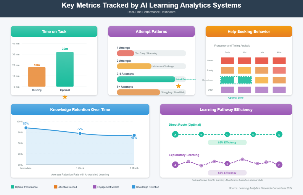 AI-Enhanced Learning Analytics provides unprecedented visibility into how learning actually happens. Traditional assessment tells you whether a student knows something at test time. Learning analytics reveals the journey—how they approached problems, where they got stuck, what strategies they used, and how their understanding evolved.